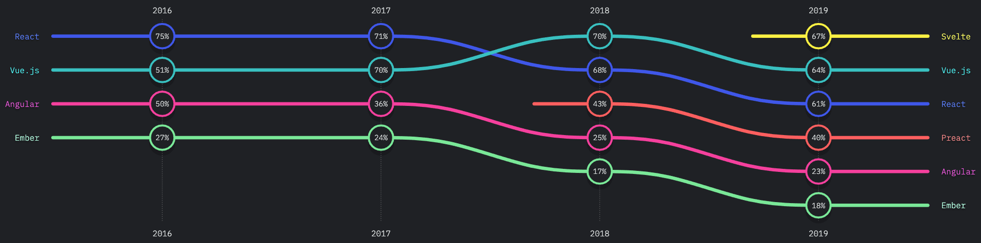 스벨트는 리엑트, 뷰, 앵귤러 프론트엔트 3대장 자리를 위협하며 2019년 관심도 1위를 기록했습니다.